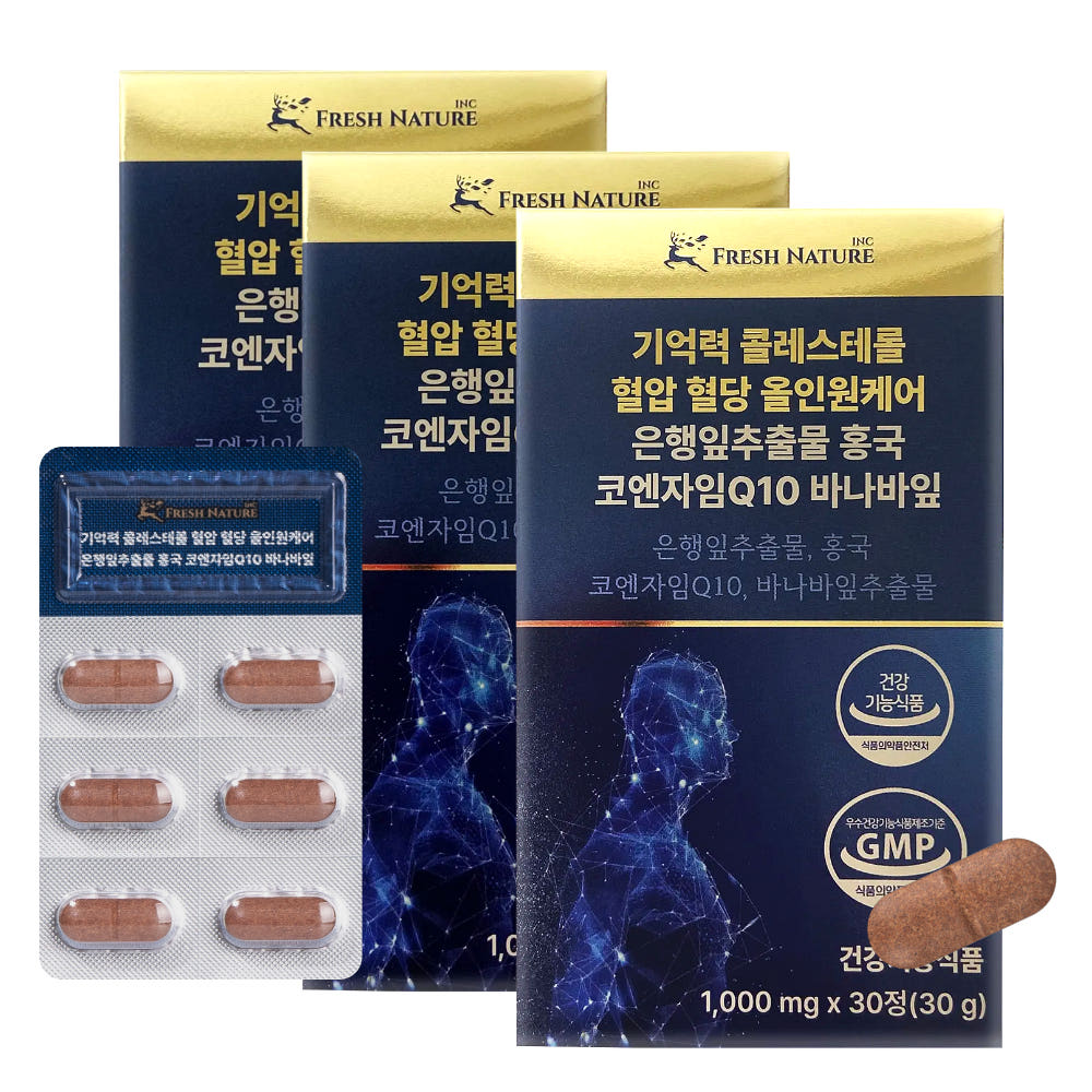 바나바잎 코엔자임Q10 홍국 은행잎추출물 콜레스테롤 혈압 혈당 기억력 30정, 3개